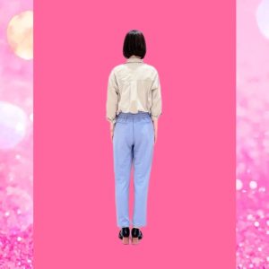今回さらにご相談者様のご要望をお伺いしまして動きやすくご家庭でもお洗濯可能でお手入れしやすく、なおかつ肌触りも良く伸縮性のある「ジャージー素材」のテーパードパンツを選ばせていただきました。また気になるウエスト周りもゴム素材でとっても着脱が楽なんですよ。ヒップにはダミーポケットが付いていますのでヒップ位置を高く見せる効果もあり後ろ姿もスタイルアップできます。股上が深いので座った時も締め付け感がなく伸縮性のある素材なので膝を曲げ伸ばししても楽ちんです。カジュアルなイメージのジャージー素材なのですが上品なシボ感がありブラウスをインして羽織りものを着用しパンプスなどと合わせるとオフィスコーデやセレモニースタイルにも応用可能です。