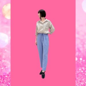 はい、こちらは5色展開でグレー、ブラック、ベージュ、オレンジ、ブルーとなっております。今回イエベ秋の私が着用しておりますのは春をイメージしましたブルーのテーパードパンツです。サイズ展開はSSから3Lまでございます。